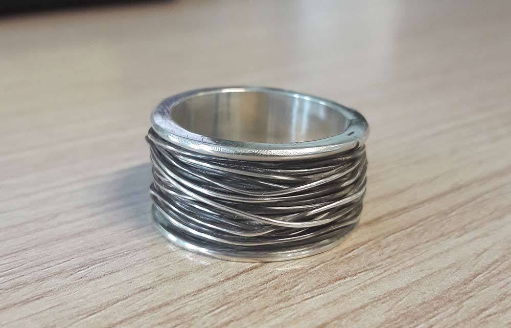 J’ai formé l’anneau avec un triboulet et un maillet en caoutchouc. Les bords sont faits avec des anneaux soudés (faits à partir d’un fil d’argent). Le noir entre les fils d’argent est obtenu avec de la javel. La bague est ensuite polie pour faire ressortir l’argent à certains endroits. Cela permet d’obtenir ce beau contraste.