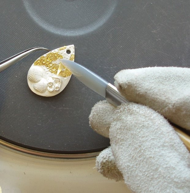 Pour que les deux métaux adhèrent, il n’y a pas besoin de soudure. L’or et l’argent ont une structure atomique presque identique et devienent instable une fois le métal chauffé entre 350°C et 500°C. Dès que cette température est atteinte, on exerce un frottement sur la feuille d’or (avec un outil d’acier ou d’agate poli: un brunissoir), ce qui provoque une pression et la feuille adhère de façon permanente à la surface en argent.