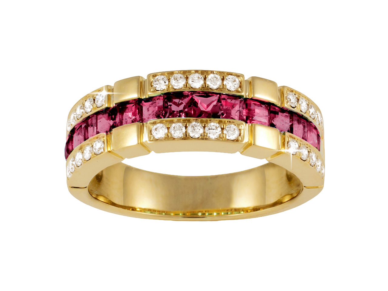 Bague 3 rangs 7 mm, diamants 0,30ct et rubis princesse 1,28ct, Or jaune 18k, doigt 56 - XLFRA55J