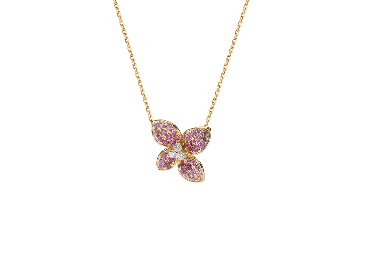 Collier Fleur 15 x 20 mm, diamants 0,09ct, rubis 0,21ct et saphirs roses 0,33ct, 40-42-45 cm, Or jaune 18k - VLFRA350
