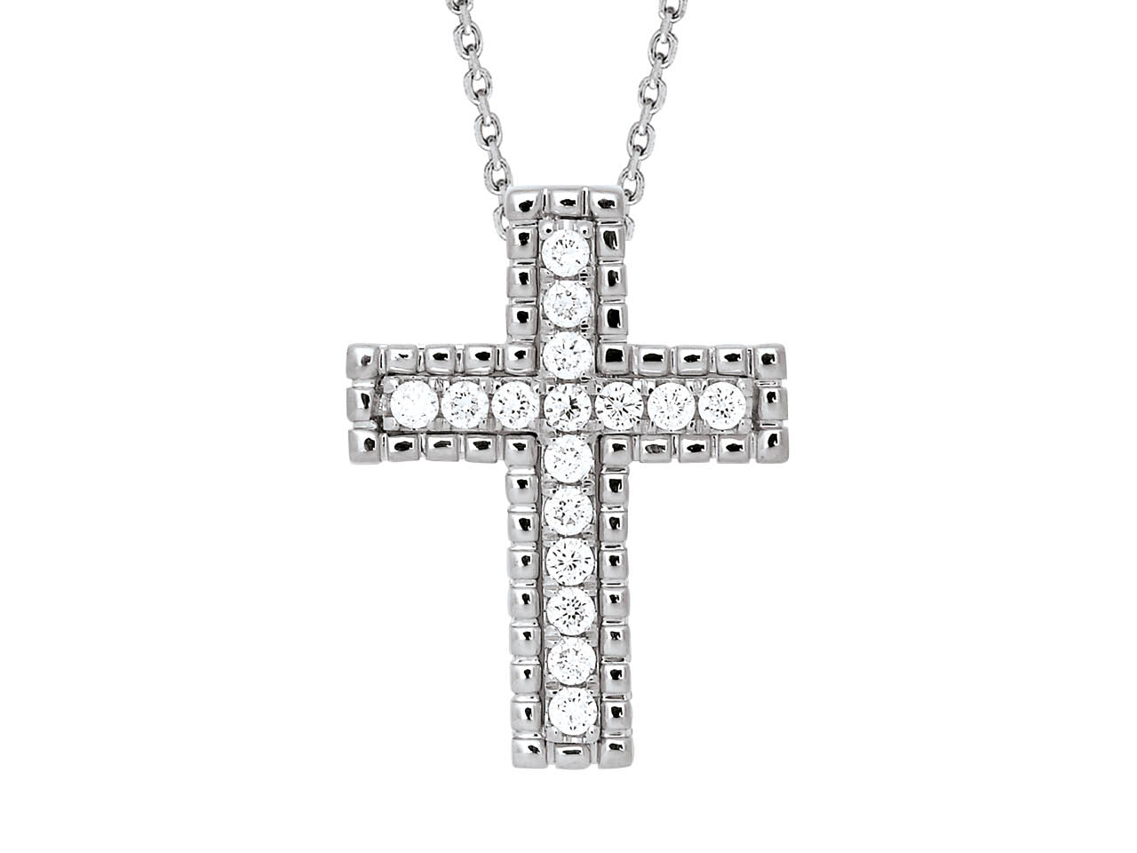 Pendentif Croix fil perlé extérieur chaîne passante, diamants 0,23ct, Or gris 18k - Image Standard - 1