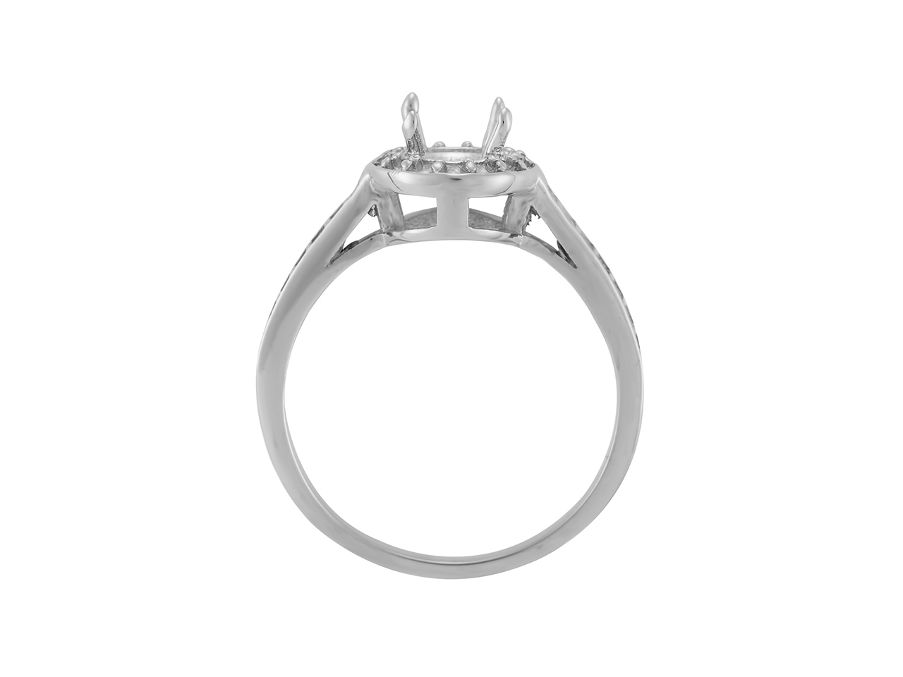 Entourage avec une pierre centrale ronde de 5,60 mm, et 14 pierres de 1,40 mm sur le corps de bague. En Or Gris 800.