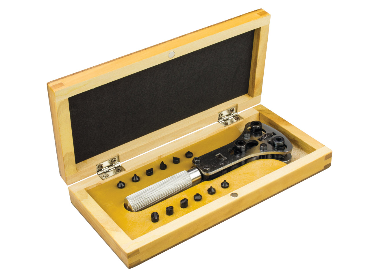Clé style Jaxa avec manche pour ouvrir et fermer les fonds de boitiers de montres vissés. Grace à ses trois mors qui intensifient la tenue sur le fond de boitier et son manche qui décuple la fo...