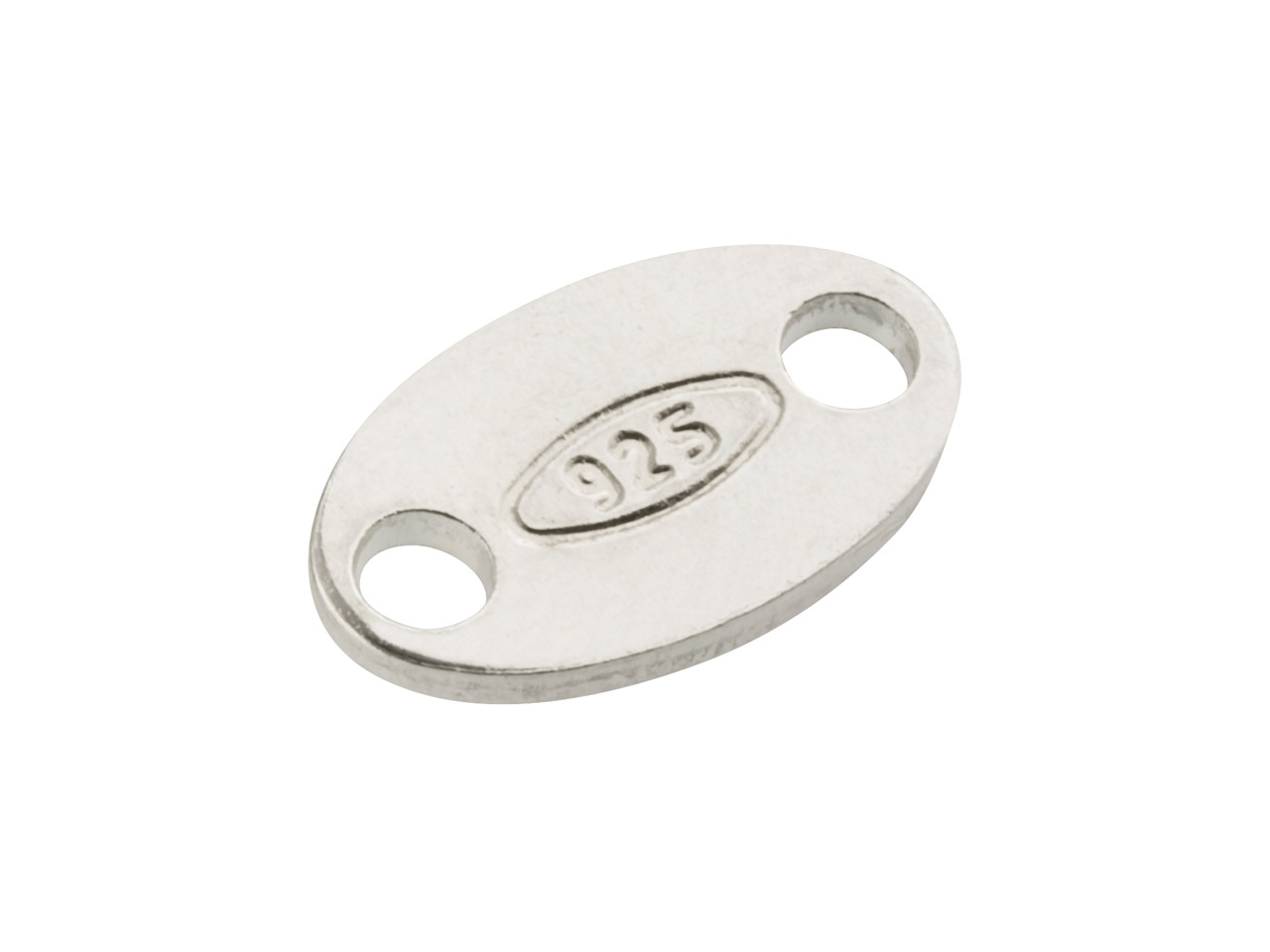 Petite plaque format étiquette estampillée 925, en argent 925 écroui, prête pour le poinçonnage. Longueur : 7,09 mm. Largeur : 3,9 mm. Epaisseur : 0,60 mm. Elles sont livrées par sachet de 10.