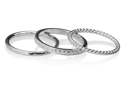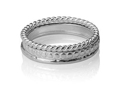 Cette bague multi-anneaux, comporte 3 anneaux en Argent 925 : un anneau rond texturé martelé, un anneau rond torsadé et un anneau plat avec des cercles comme motif. Ces anneaux peuvent se porte...