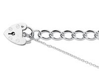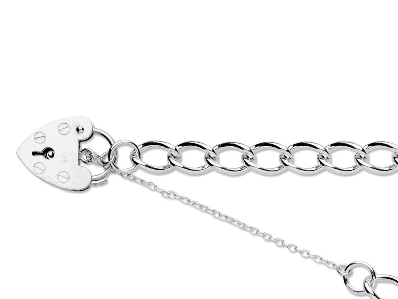 Bracelet en argent 925 de 19 cm, en maille gourmette. Fermeture avec un cadenas de 12 mm. Bracelet avec chaîne de sécurité.