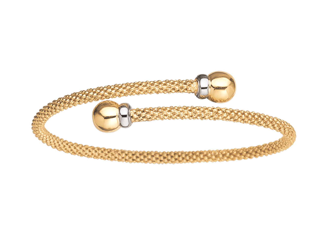 Bracelet Jonc résille de 4 mm de largeur et 59 mm de diamètre. En Or Jaune 18k, avec deux rondelles en Or Gris 18k.