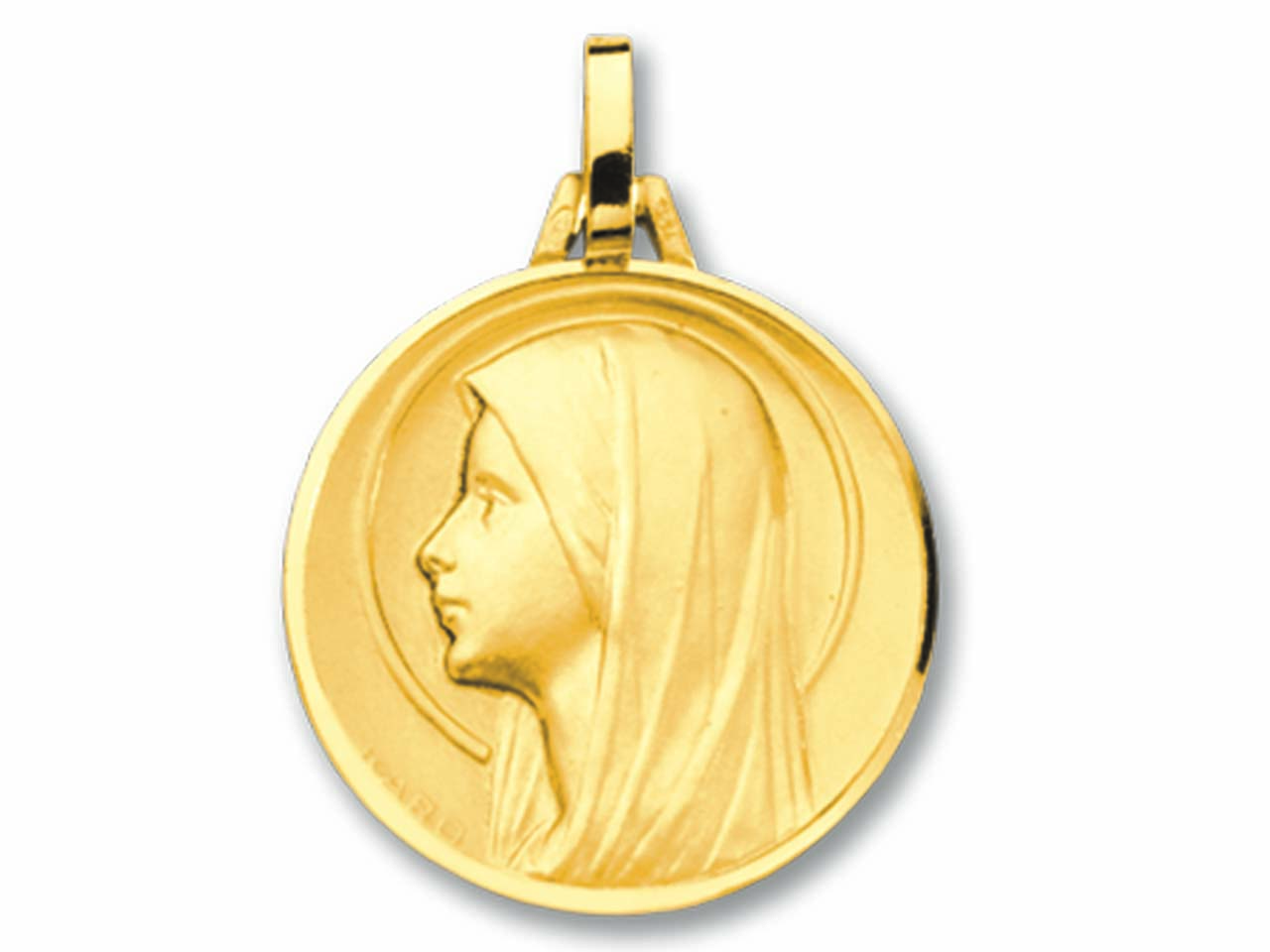Diamètre : 20 mm. Etat de surface : Mat. Fermoir : Invisible. Or jaune 18k. Finition du bord : Bord lapidé. Motif représenté : Vierge auréolée de profil.
