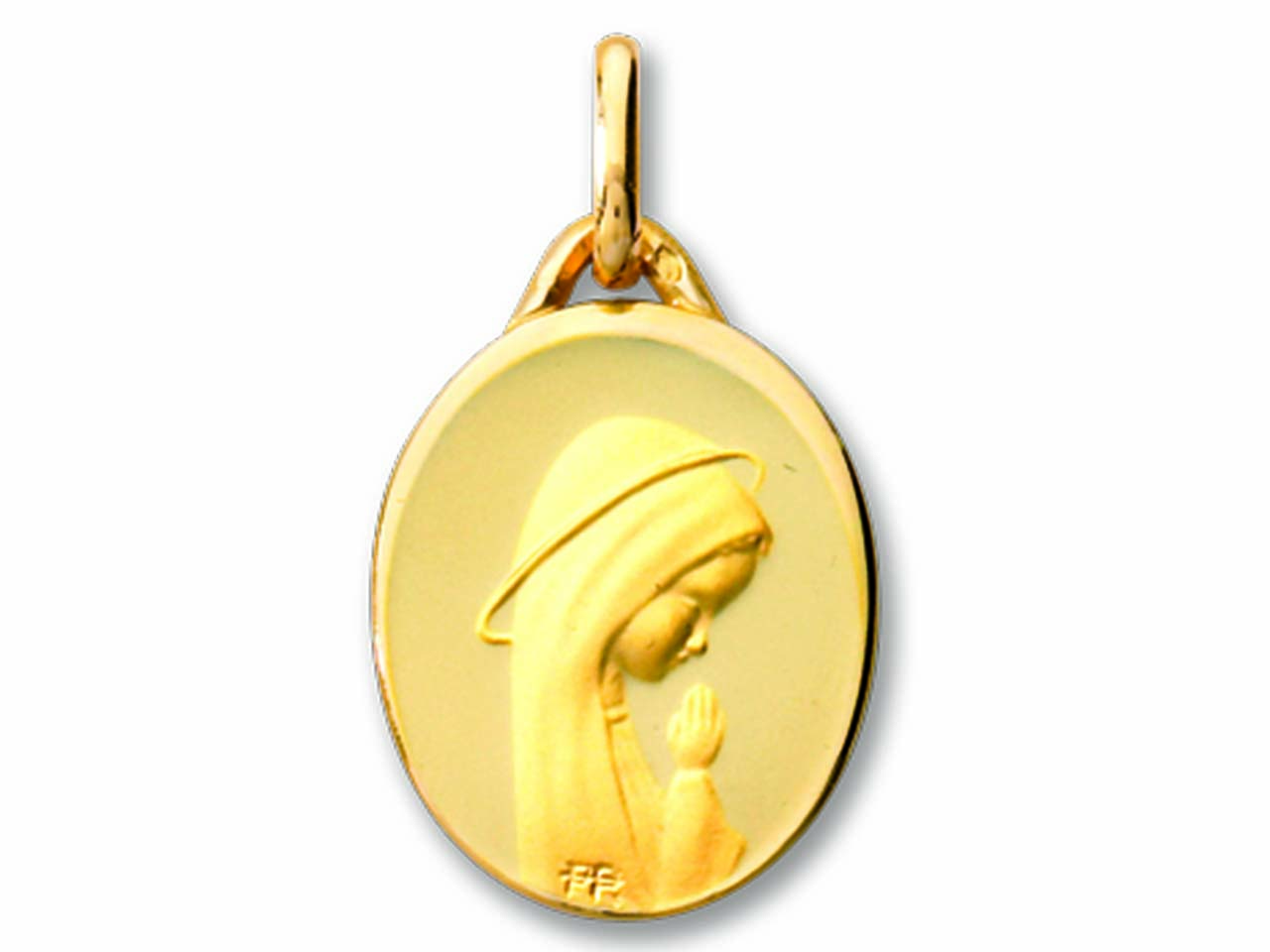 Hauteur : 19 mm. Etat de surface : Mat et Poli. Or jaune 18k. Motif représenté : Vierge en prière.