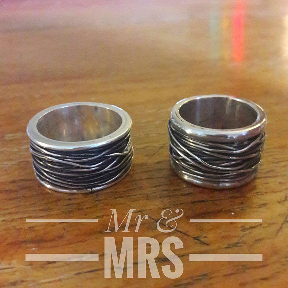 J’ai formé l’anneau avec un triboulet et un maillet en caoutchouc. Les bords sont faits avec des anneaux soudés (faits à partir d’un fil d’argent). Le noir entre les fils d’argent est obtenu avec de la javel. La bague est ensuite polie pour faire ressortir l’argent à certains endroits. Cela permet d’obtenir ce beau contraste.