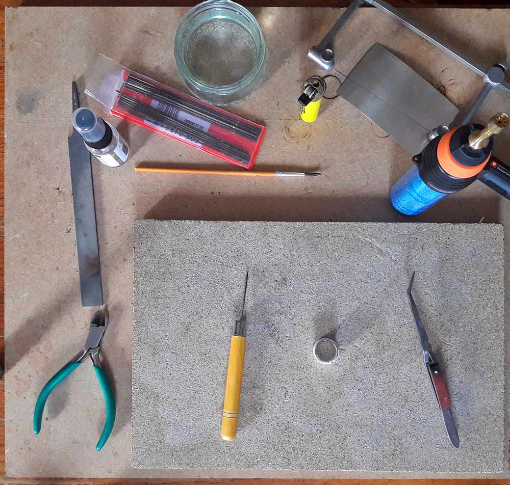 La création avec laquelle j’ai gagné le concours du mois de Juin est une bague totalement en argent. C’est ma première conception de A à Z. Ça faisait un moment que je rêvais de faire mes propres bijoux en argent. J’ai décidé de me lancer il y a un peu plus d’un mois, j’ai regardé beaucoup de vidéos sur youtube et j’ai commandé sur Cookson-clal tout le matériel nécessaire (plaques et fils d’argent, brasure et tout ce qui va avec, bocfil, lime, triboulet,…). Suite à ça je me suis pas mal entraîné à souder des simples anneaux, et il y a 2 semaines j’ai voulu tester la réalisation d’un vrai bijou.