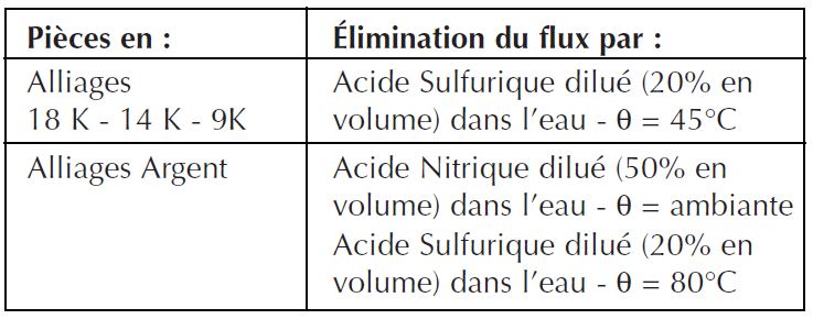 Il est indispensable d’éliminer le flux qui demeure sur les pièces une fois que le brasage est terminé. L’élimination des flux se fait généralement par immersion dans l’eau chaude ou dans un acide approprié à l’alliage.