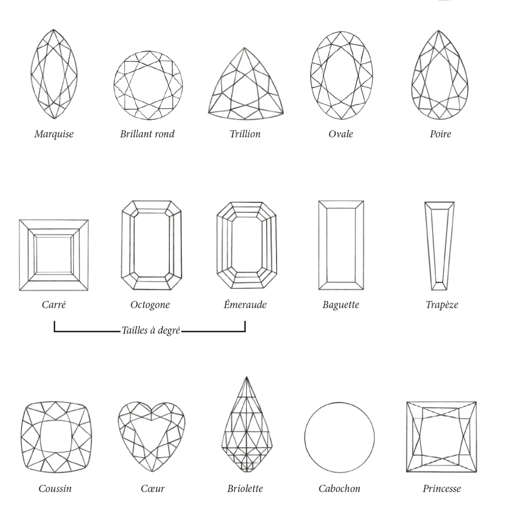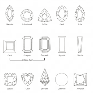 Les plus connues sont les tailles marquise, coussin, princesse, poire, émeraude, ovale, baguette et cœur, illustrées ci-contre :