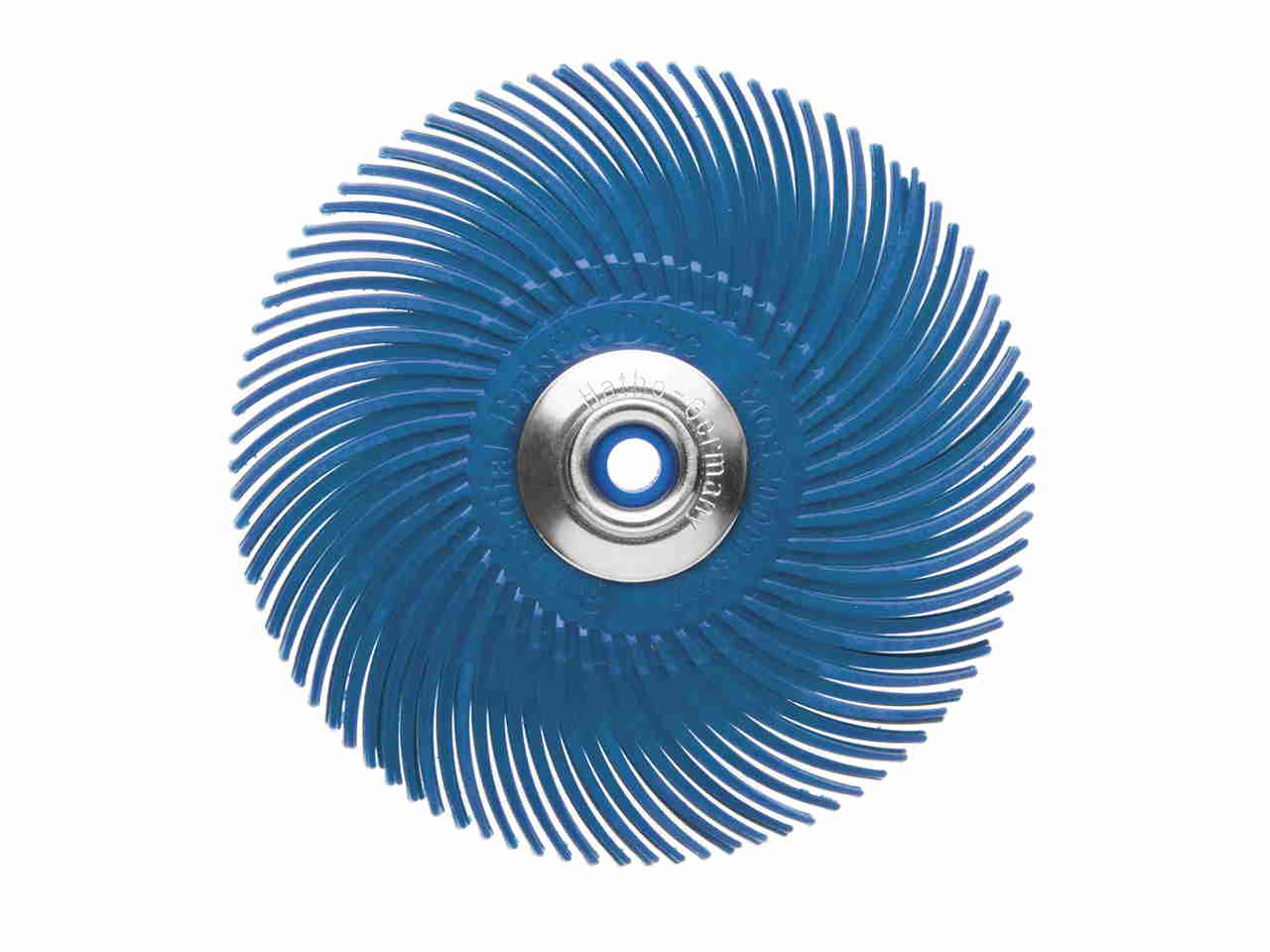 Brosse HABRAS n° 903 bleu, grains fins de HATHO. Diamètre 76 mm. Utilisation : pré-polissage. Grains : corindon. Ce sont des brosses en disques de polyamide doux, contenant du produit de pré-po...