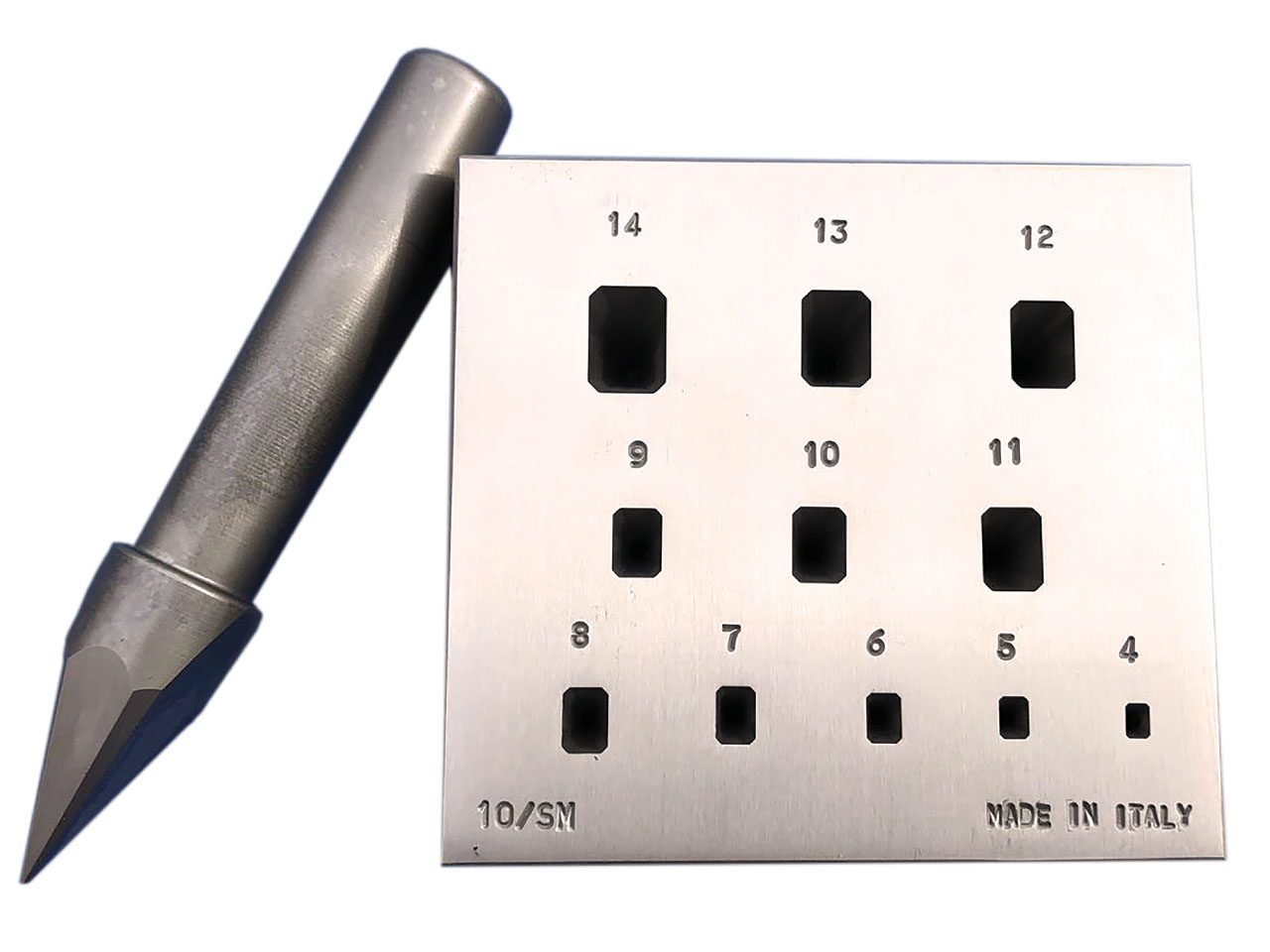 Chatonniere de forme rectangle émoussé avec angle de 17°. Dimensions des trous : de 4 x 2,8 à 14 x 10 mm. Chatonniere en acier.