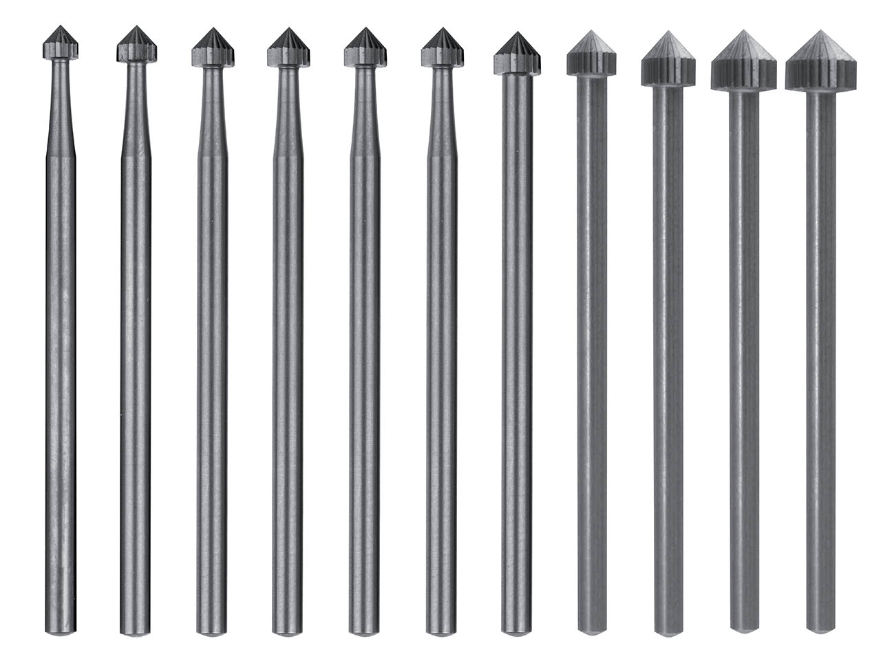 Jeu de 11 fraises en acier haute qualité fabriqué par la société Busch. Fraises Sertisseurs cylindriques pointues pour mises en pierre. Diamètres : 3,50 mm, 3,75 mm, 4 mm, 4,25 mm, 4,50 mm, 4,7...
