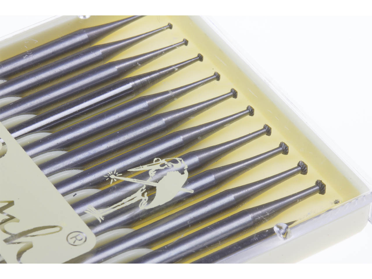 Jeu de 12 fraises Busch, référence 414. Qualité supérieure d'acier au Tungstène Vanadium. Diamètres des fraises : 0,70 mm, 0,80 mm, 0,90 mm, 1,00 mm, 1,10 mm, 1,20 mm, 1,30 mm, 1,40 mm, 1,50 m...