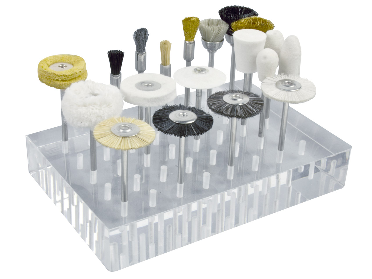 Kit de polissage composé de 19 accessoires. Avec une brossette circulaire Chamois, une brossette circulaire Coton, deux brosses circulaires Soie Noire, une brossette circulaire Soie Grise Noire...