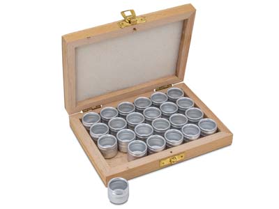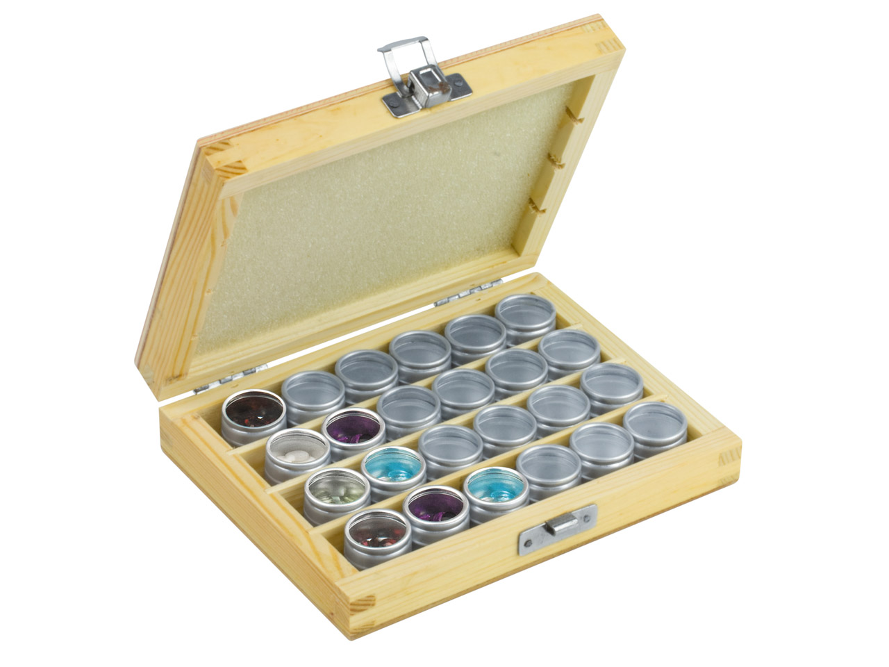 Boîte de rangement en bois, avec 24 boîtes rondes en aluminium et couvercles transparents. Idéal pour ranger les poudres d'émail, les perles, pierres ou autres petits objets. Dimensions de la b...